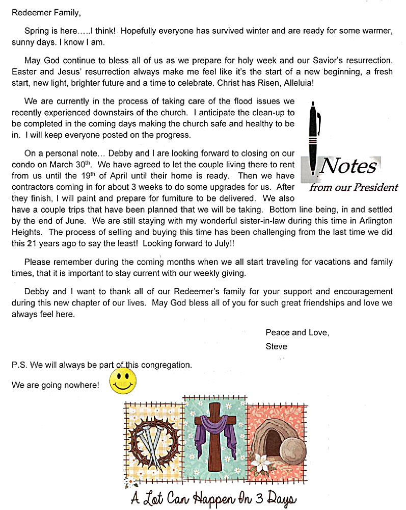 We had a presentation in March by Jennifer Kanacki to educate the congregation on the Crisis Center of South Suburbia. During this time, envelopes were passed out so that members could make a donation to this worthy cause. We will be accepting donations until Easter. Please make checks out to Redeemer’s and put a comment on your envelope about the amount and write Crisis Center, so that it will be directed to them. Thank you for your support.